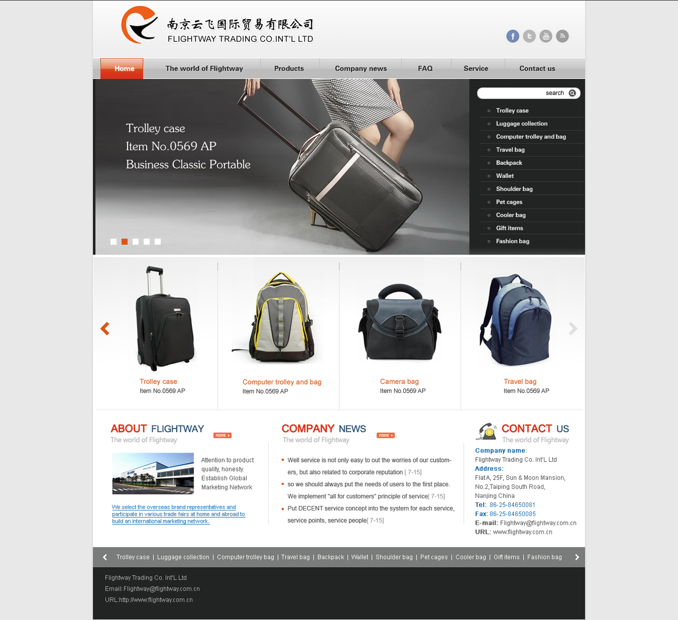 Flightway trading co.international Ltd is professional manufacturer of various kinds of traveling goods.We are specialized in making all kinds of trolley cases,duffle bags, computer bags,backpacks handbags,briefcases and luggage sets etc.